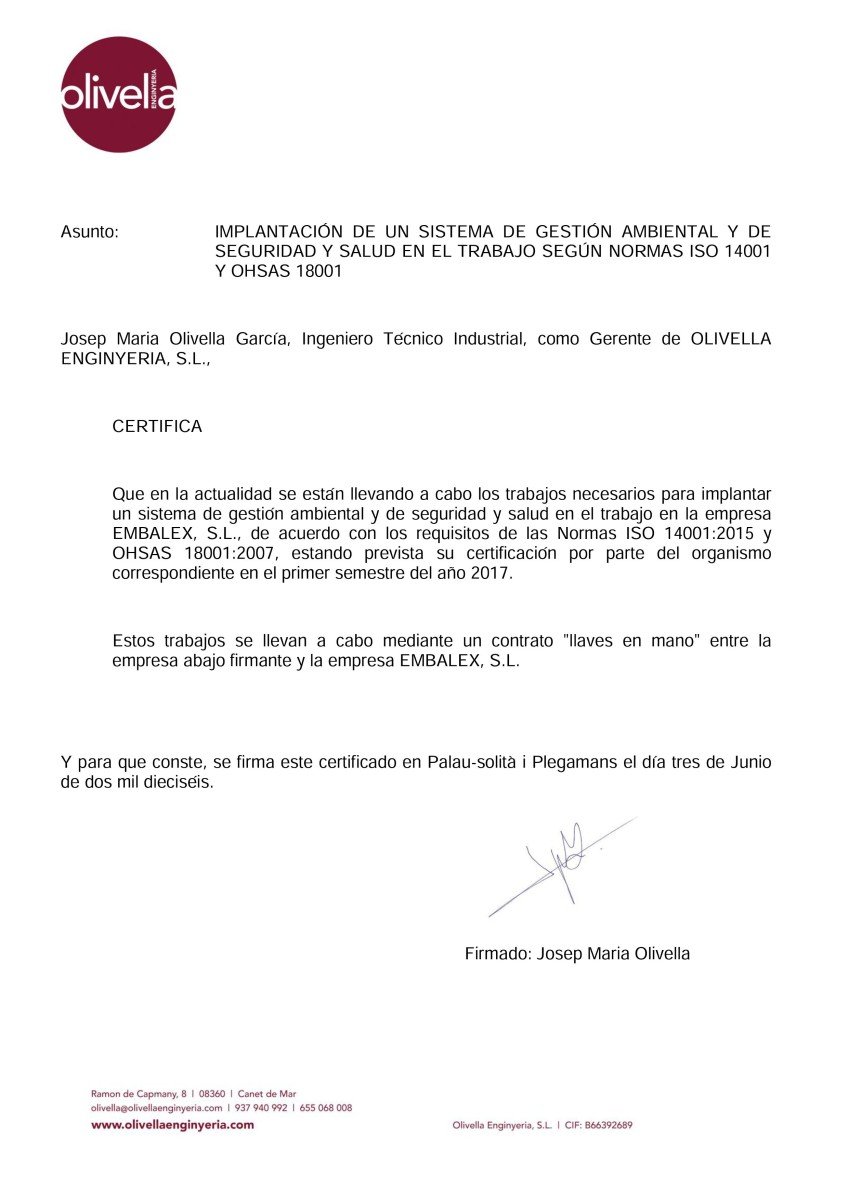 Nos complace comunicarles que en el Grupo Embalex hemos empezado a implantar un sistema de gestión ambiental y de seguridad en el trabajo según las normas ISO 14001 y OHSAS 18001, deseando obtener una ventaja competitiva, diferenciarnos de la competencia, demostrar nuestra preocupación por el medio ambiente y la seguridad en el trabajo e iniciar un proyecto para satisfacer las exigencias de nuestros clientes.